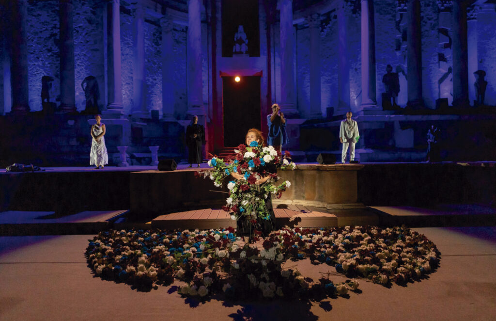 No es tanto por desconfianza de otros colaboradores, a veces también es por fechas o por medios económicos, porque al final es mucho trabajo para mí, pero es verdad que yo lo sueño todo a la vez. Cuando digo lo sueño, lo imagino, ¿no? Lo sueño todo a la vez, entonces es verdad que hay cosas como la iluminación, que yo no la podría afirmar nunca, porque no es algo en lo que estoy formada, aunque tenga ideas para darle al diseñador. Sin embargo, en el vestuario, por ejemplo, lo veo claro, casi lo leo y más o menos hay algo que ya veo cómo van los personajes. Entonces, a veces, hacerme el diseño de vestuario es irme de compras o ir al taller en vez de ir yo, porque lo he soñado y lo he dibujado casi todo. Y a veces cuando he trabajado con un artista como Leandro Cano, por ejemplo, en Los cuerpos perdidos, no es así porque él me plantea. Hay otras fechas donde eso es más largo porque ahora él me tiene que convencer de que su idea, y como es un gran artista, evidentemente le compro muchas cosas. Y en el caso del espacio aquí, como siempre tuve claro que quería estrenar en el Teatro Romano de Mérida con el Teatro Romano de Mérida como escenografía. Nunca voy a poder mandar a un taller construirme el teatro romano de Mérida. Entonces, ¿cómo sacarle partido? En este caso no necesitaba de alguien que me hiciera el espacio escénico porque ya estaba hecho el espacio escénico. Ahora entran todos los elementos, el árbol, la moqueta para el palacio, pero para ir cambiando un poco el teatro, que siempre sea el edificio pero en otro juego escénico. No es porque quiera tener todo atado. Porque hay muchas veces que me propone un colaborador algo y que me parece maravilloso y a lo mejor yo no lo había imaginado. Pero sí es verdad que tengo claro que el todo tiene que ir a una dirección. Hay veces que cuando voy al teatro veo que fulanito ha firmado la escenografía, el director… O sea, como si te han encasquetado las cosas y veo que no vibra junto, porque eso requiere de tiempo, y requiere del proceso, que incluso estés dispuesto a cambiar.