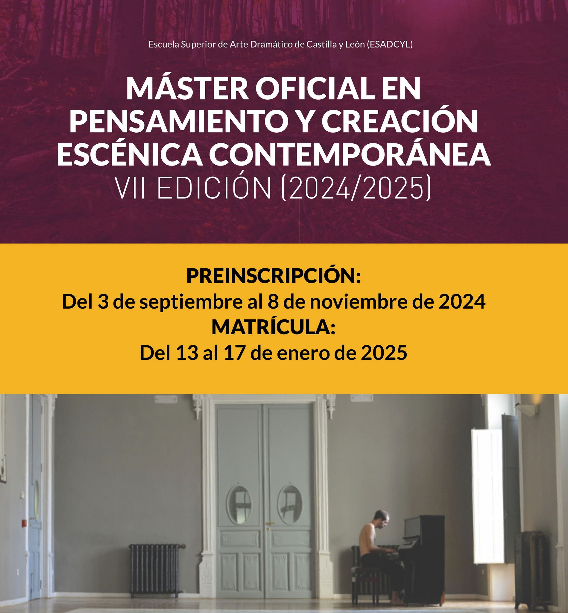 Los alumnos y alumnas interesados en cursar esta nueva edición del Máster, el primer título oficial de posgrado que imparte una escuela de arte dramático de nuestro país, podrán formalizar su candidatura (hasta el próximo 8 de noviembre) en el portal académico de la ESADCYL, donde podrán descargar el formulario habilitado para formalizar la preinscripción (https://fuescyl.com/master/admision-master). La docencia del Máster, que oferta un total de quince plazas, tendrá un carácter presencial y se extenderá entre febrero y noviembre de 2025 a través de seminarios, clases prácticas, encuentros con creadores y una residencia artística que, con un formato de laboratorio, tiene lugar cada año en un pequeño municipio del medio rural castellano y leonés.