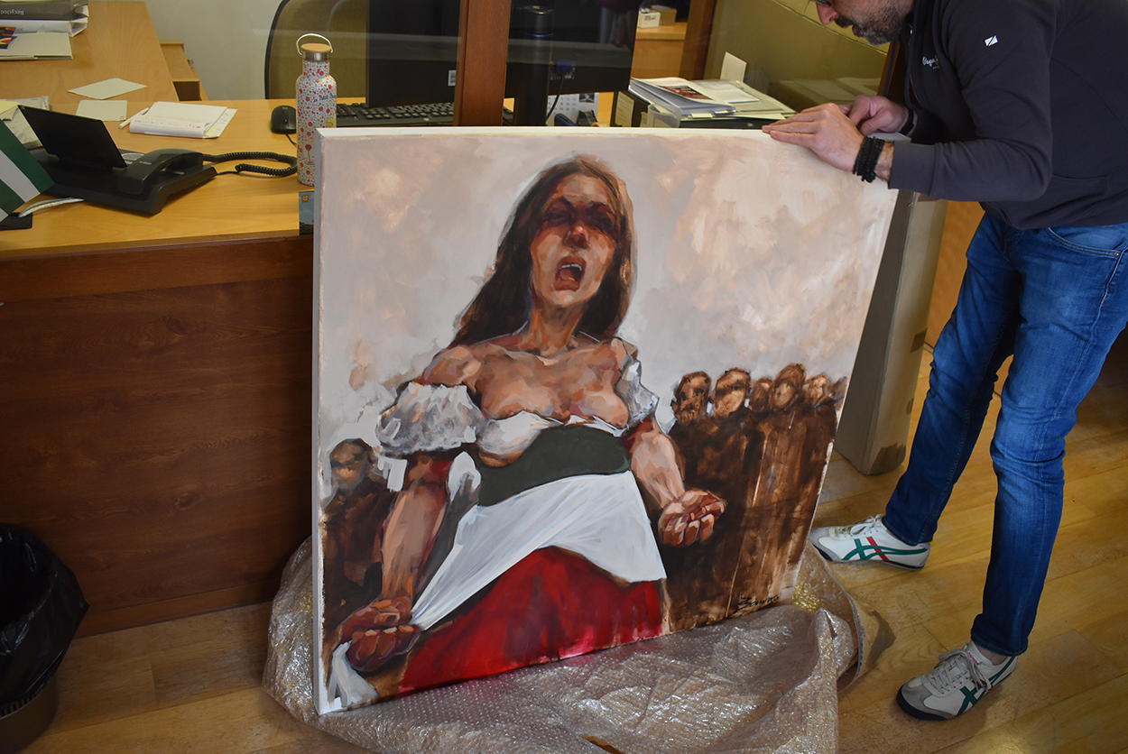 El Museo Nacional del Teatro ya contaba entre sus fondos con otra pintura de Barroso: Justicia, donada por él mismo en julio de 2023 cuando realizó una performance con la creación en directo de una obra de artes plásticas inspirada también en Fuentovejuna. Convirtió el claustro del Museo en su estudio de pintura con la actividad ‘Reinterpretando a los clásicos’. Los espectadores presenciaron en vivo, a lo largo de noventa minutos, cómo un artista afronta la elaboración de una obra y fueron testigos del desarrollo del proceso creativo. La performance, aunando artes escénicas y plásticas, formó parte de la programación del 46º Festival Internacional de Teatro Clásico de Almagro.