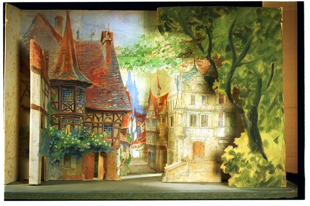 El teatríno es la escenografía del 2º acto de la ópera Los maestros cantores de Nuremberg de Richard Wagner, que se estrenó en el Gran Teatre del Liceu en 1905. Representa un cruce de calles de Nuremberg, con las casas del zapatero Sachs a la izquierda y el río Pogner a la derecha. La acción ocurre en el siglo XVII.