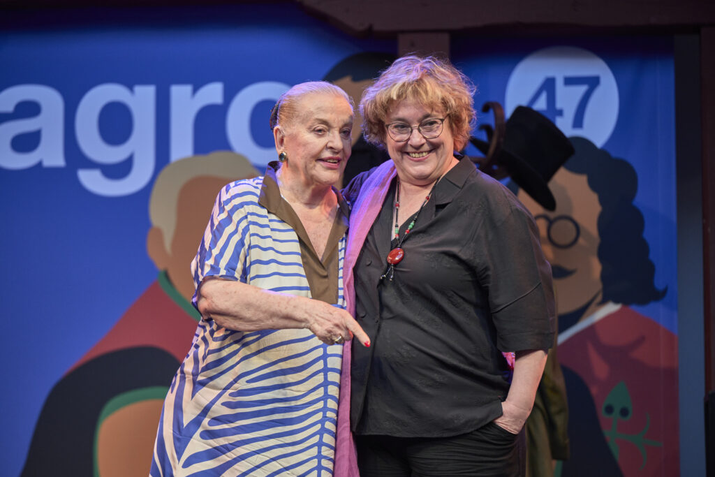 Laila Ripoll: «Había escrito muchas cosas,… pero ahora no sé ni qué decir. Gracias. No estoy excesivamente nerviosa porque veo que estamos entre amigos, parece una reunión de Micomicón. Los que me conocéis sabéis que no soy de enrollarme mucho, pero quiero expresar mi gratitud. Hace 33 años que pisé el Corral de Comedias por primera vez. En Almagro he desarrollado toda mi carrera laboral. Mi hijo jugó en este patio, e incluso lo amamanté, seguro que le dará mucha vergüenza oírlo, en estas sillas. Todo lo importante que me ha pasado en la vida está ligado a este festival. Nos han pasado muchas cosas aquí como compañía. Agradezco a todos los que están y ya no pueden estar entre nosotros, y a todos los que han formado parte de la compañía y que han sido tan importantes en Almagro. Gracias al festival, gracias a Irene. Soy profundamente feliz. Soy muy feliz».