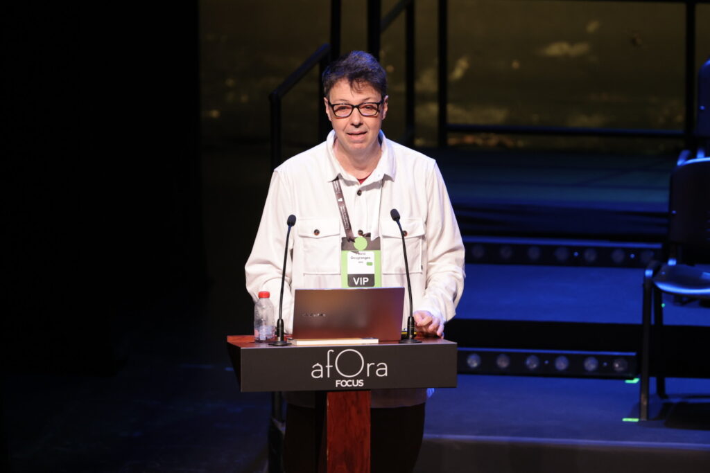 A continuación, Flàvio Desgranges, autor de libros como La pedagogía del espectador y El acto del espectador, ofreció la conferencia Dicerse público: entre la mediación teatral y el efecto estético, en la que analizó la relación entre teatro y público en el contexto actual, explorando cómo las prácticas escénicas abordan las urgencias de la sociedad y los cambios históricos en el arte teatral.
