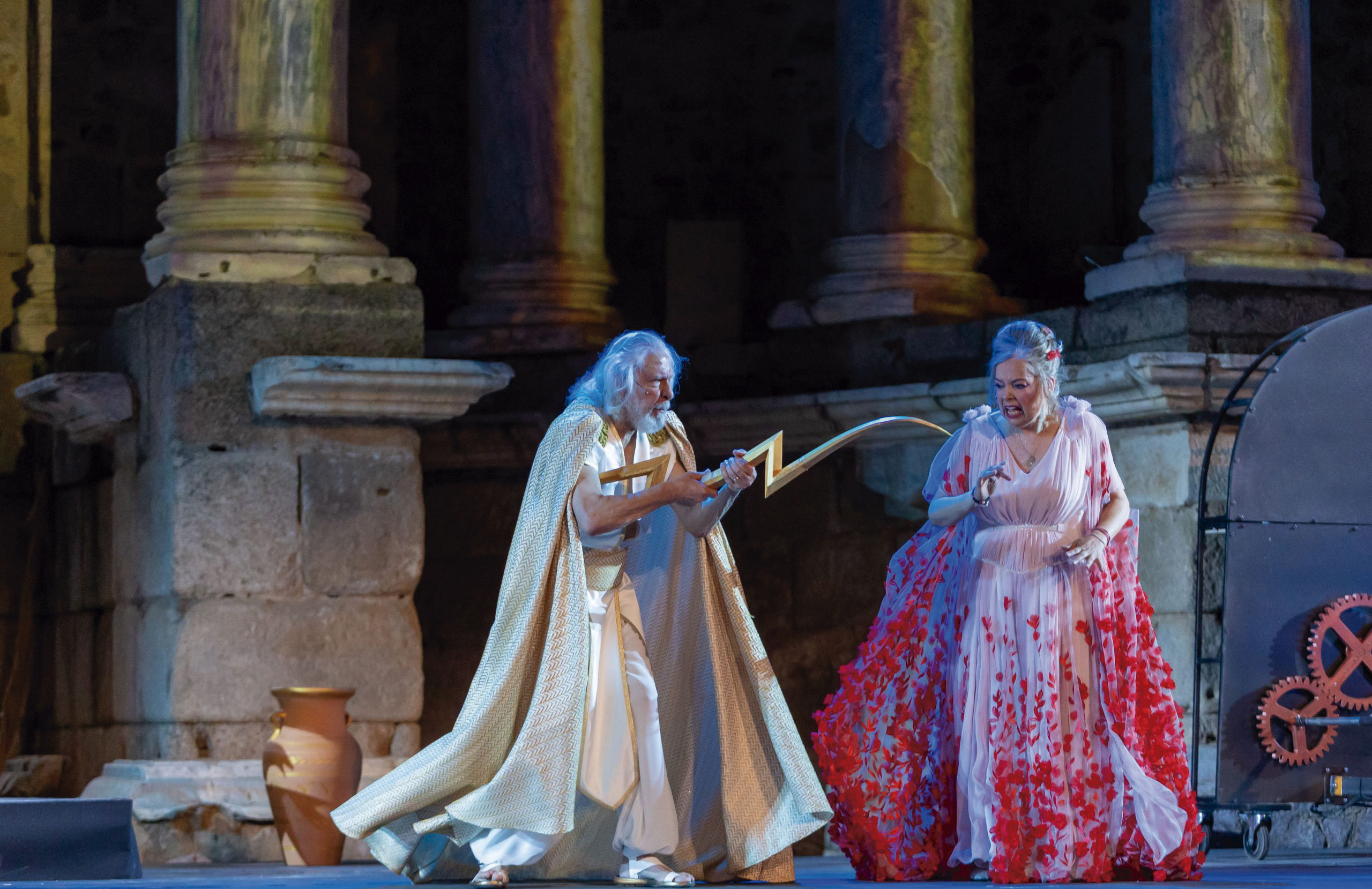 La historia cobra vida en el escenario gracias a la sencilla pero efectiva escenografía diseñada por Juan Antonio Moreno, especialmente concebida para el Teatro Romano de Mérida. Apoyada por las impresionantes proyecciones de videomapping creadas por Carlos Lucas, transporta al público al fascinante mundo del Olimpo. Funcional y versátil, la escenografía permite una fluida entrada y salida del reparto, mientras que las proyecciones otorgan inmersión y magia a la narrativa. La iluminación experta de Rubén Camacho complementa perfectamente el diseño técnico, creando atmósferas cautivadoras capaces de realzar la belleza y el misterio del relato mitológico y humano.