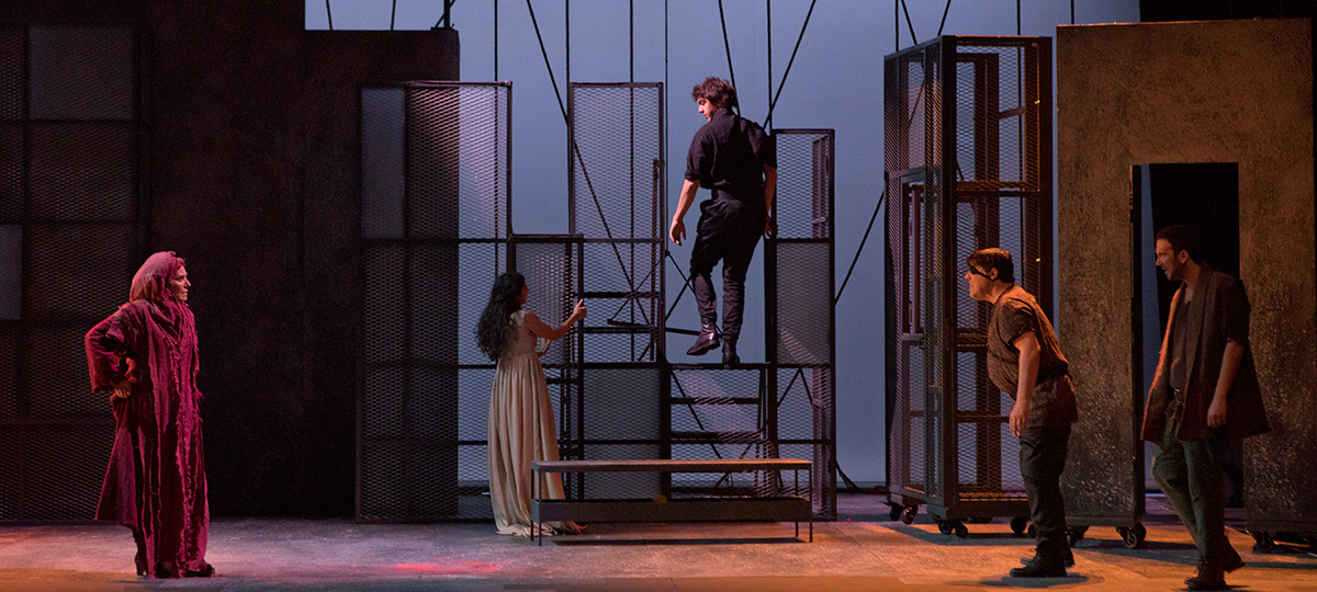 El diseño de escenografía de Mónica Teijeiro es funcional, efectivo y destaca por su simplicidad y versatilidad. El uso de elementos móviles permite una fácil adaptación y movilidad del reparto en el escenario, facilitando así la fluidez de las escenas y la transición entre diferentes ambientes y situaciones. También se encarga del diseño de vestuario, otro de los aciertos de esta producción. A través del uso de telas, colores, cortes y accesorios específicos logra que los actores se metamorfoseen en cada uno de sus papeles y que nos cueste distinguir quien se esconde tras ellos. Con su maestría en el uso de luces y sombras, José Manuel Guerra logra resaltar los momentos clave de la trama, enfatizar las emociones y guiar la atención del público a través del escenario. Su diseño aporta profundidad y textura a cada escena, donde los destinos de los personajes se entretejen en un tejido de pasión y desesperación.