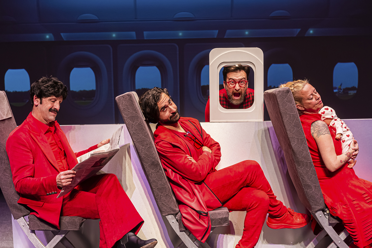 El equipo de viajeros, en alternancia, está formado por César Maroto, Rubén Hernández, Susana Cortés, Edu Ferres y Estefanía Rocamora. Todos formados en el humor gestual con números individuales y colectivos sobresalientes. Sin pronunciar una sola palabra, logran transmitir una amplia gama de emociones y situaciones cómicas a través de su desbordante gestualidad facial y movimientos corporales. Es fascinante presenciar cómo logran establecer una conexión instantánea con el público, generando risas y carcajadas sin necesidad de utilizar diálogos verbales. La dificultad de hacer reír sin recurrir a la palabra habla del talento y la habilidad de estos artistas. Su dominio de la comedia física y el timing cómico es excepcional. Cada gesto, cada mirada y cada movimiento está cuidadosamente ejecutado, lo que crea una dinámica perfecta que desencadena las risas del público. Además del ingenio gestual, utilizan recursos como las onomatopeyas de manera pertinente. Los sonidos cómicos y exagerados agregan un elemento extra de humor a las escenas, intensificando la comicidad de cada situación. Las onomatopeyas se convierten en un lenguaje universal entendido por todos y que nos sumergen aún más en el mundo absurdo y divertido creado por Yllana.