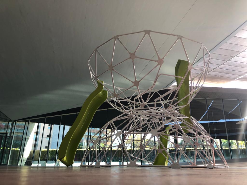 Formada por un suelo de madera, un tambor, un vibrador y toboganes infantiles, Esquinitas / La Pastilla es resultado del diálogo cruzado entre ambos artistas.