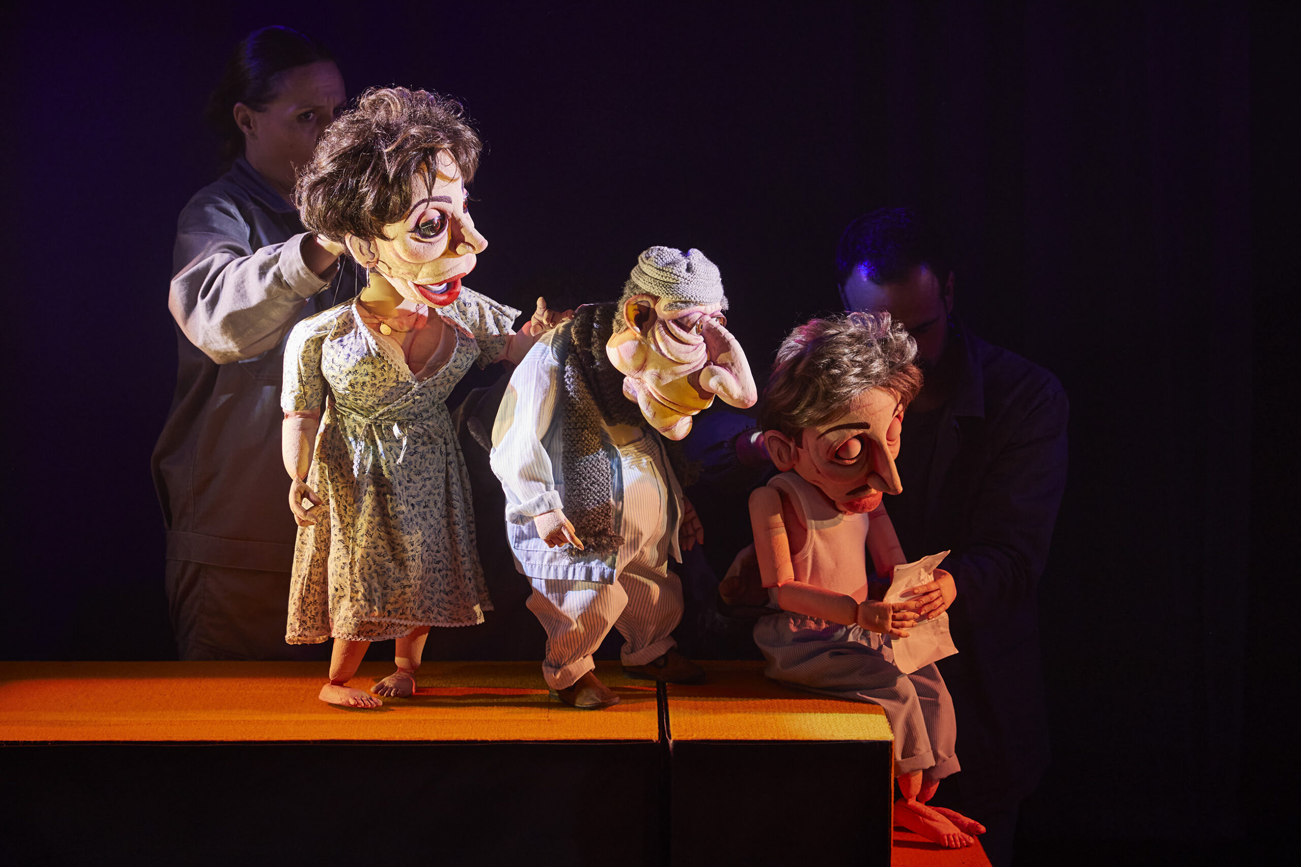 Asimismo, el trabajo con los intérpretes es crucial, pues sin ellos las marionetas no cobran vida. “Ellas sienten, padecen, ríen, lloran”. Por este motivo, Calvente se rodea habitualmente del mismo equipo de actores y de actrices. “Ellos y ellas son los que pueden transmitir la energía a la marioneta y de la marioneta al público”. En este sentido, la obra consigue “llevar al espectador a ese mundo con sorpresa y alegría, aunque también hay momentos trágicos, pero esa mezcla imposible encarnada por marionetas hace que la gente entre y se convierta”, afirma Ángel. De hecho, apunta a que uno de los motivos por los que cree que la obra funciona se debe a la vigencia de su discurso pues existe una “parte de España que hoy mira con ojitos enamorados a tiempos pasados de esa España gris, de hombres y mujeres sin futuro. Por eso creo que el público debe ver el sufrimiento de aquella España en blanco y negro. El verdugo te retrae y te trae, te lleva y te enseña”.