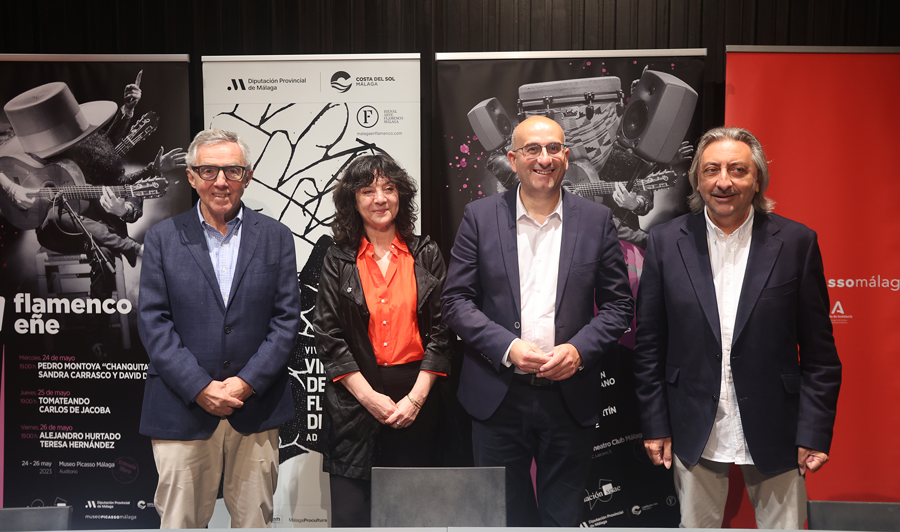(De izda a dcha): José Lebrero, director de Museo Picasso Málaga; Nani Soriano, directora de la VIII Bienal de Arte Flamenco de Málaga, Manuel López, diputado de cultura de la Diputación de Málaga, y Juan Carmona, coordinador de flamenco de la Fundación SGAE