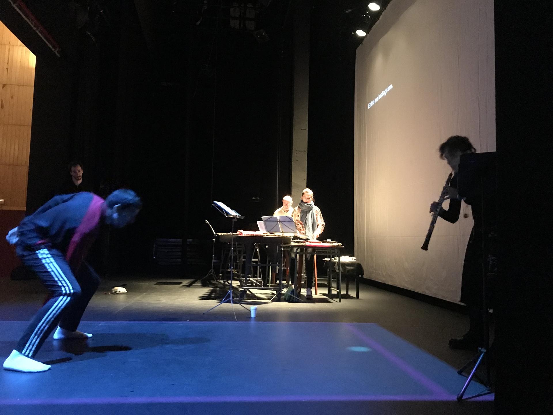 El director musical Alberto Bernal explica que en el escenario, los intérpretes reproducen a su modo el planteamiento de la obra entre el juego y el trabajo que esclaviza, oponiendo los juegos sonoros y el movimiento supuestamente libre de dos músicos (oboístas) y un bailarín a la repetición mecánica, alienante hasta casi la extenuación que realizan los otros dos músicos (percusionistas) y el segundo bailarín.