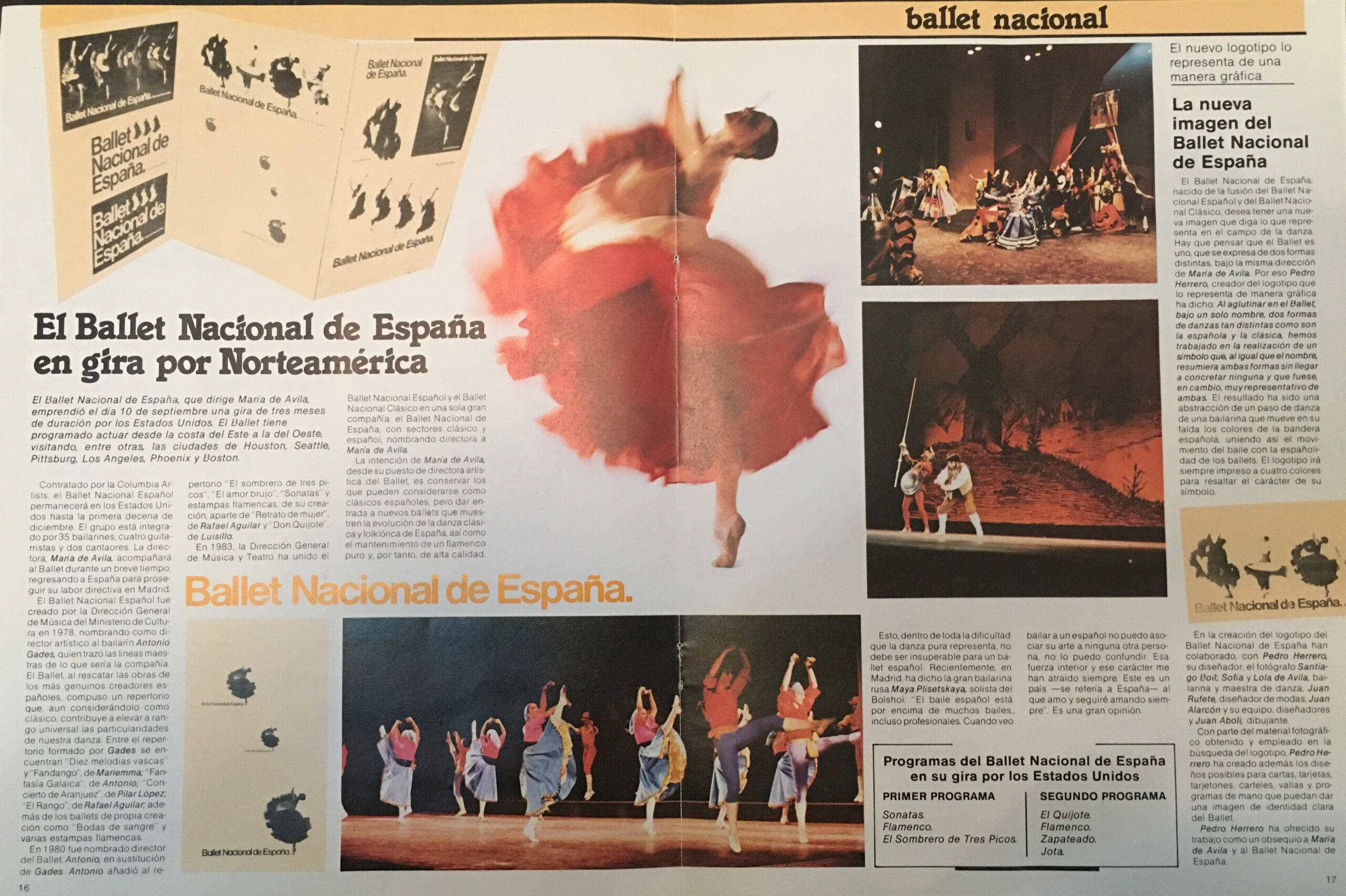 El Ballet Nacional de España, nacido de la fusión del Ballet Nacional Español y del Ballet Nacional Clásico, desea tener una nueva imagen que diga lo que representa en el campo de la danza. Hay que pensar que el Ballet es uno, que se expresa de dos formas distintas, bajo la misma dirección de María de Ávila. Por eso Pedro Herrero, creador del logotipo que lo representa de manera gráfica ha dicho: «Al aglutinar en el Ballet, bajo un mismo nombre, dos formas de danzas tan distintas como son la española y la clásica, hemos trabajado en la realización de un símbolo que, al igual que el nombre, resumieran ambas formas sin llegar a concretar ninguna y que fuese, en cambio, muy representativo de ambas». El resultado ha sido una abstracción de un paso de danza de una bailarina que mueve en su falda los colores de la bandera española, uniendo así el movimiento del baile con la españolidad de los ballets. El logotipo irá siempre impreso a cuatro colores para resaltar el carácter de su símbolo.