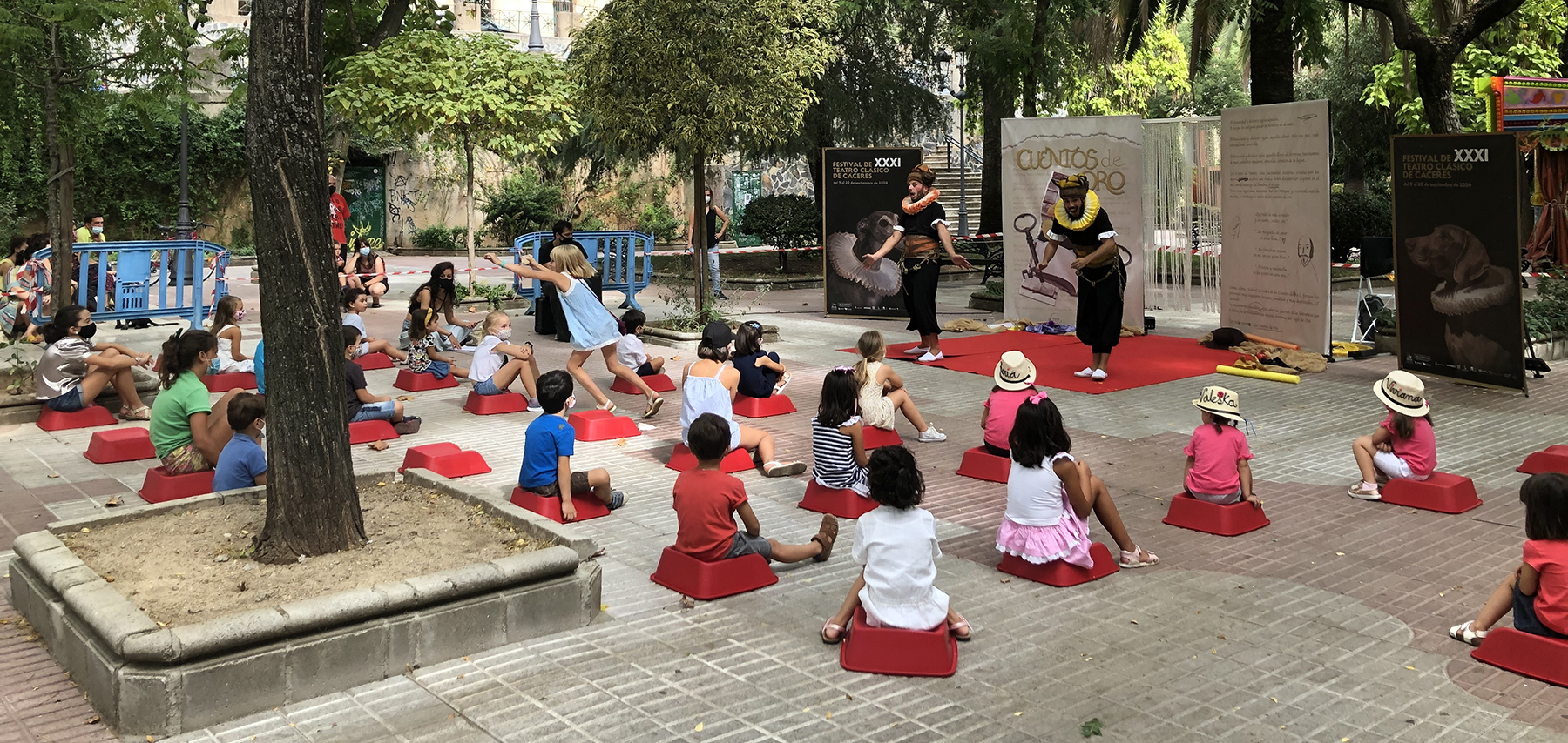 «Cuentos de Oro «es un proyecto enfocado a los niños para la 31 edición del Festival de Teatro Clásico de Cáceres. Se trata de la continuación o segunda temporada ya desarrollada con éxito en la pasada edición del festival. «Cuentos de Oro» mantiene el objetivo de acercar al público infantil las historias clásicas de la época dorada de la literatura española. A través del arte de contar, los más pequeños se introducen en un imaginario diferente a su realidad; les ayuda así a potenciar sus aptitudes creativas. Un objetivo pedagógico traducido en entreteniendo para las mañanas de los fines de semana que incluye el festival. Para llegar a los más pequeños, provocarles sensaciones y emociones; el formato ideal es el cuento. En su segunda temporada, “Cuentos de Oro” está protagonizado por dos serenos perdidos en la época actual que el público infantil ya conoce y los identifican. J y S tienen las llaves que abren las puertas hacia diferentes autores e historias de la edad dorada de la literatura española. En este caso las puertas nos trasladan al mundo femenino del siglo de Oro, como formula par rescatar y poner en valor la palabra escrita por mujeres olvidadas y relegadas a un segundo plano en la historia de la literatura universal. Así, en esta nueva temporada de Cuentos de ORO ponemos en valor las historias y la vida de escritoras como María de Zayas, probablemente la primera escritora profesional en español; la poetisa y dramaturga mexicana Sor Juana Inés de la Cruz, madre de las letras hispanoamericanas; o la reformadora religiosa Santa Teresa de Jesús. Una mujer de carácter fuerte y tenaz. ¿Cuántas más como ellas habrán existido?