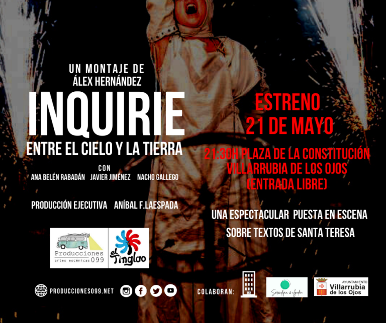 Producciones 099 y El Tinglao presentan el próximo sábado 21 de mayo a las 21:30h en la Plaza de la Constitución de Villarrubia de los Ojos (Ciudad Real) su nuevo espectáculo, un impresionante montaje sobre textos de Santa Teresa, dirigido por Álex Hernández. En escena: Ana Belén Rabadán, Javier Jiménez y Nacho Gallego...