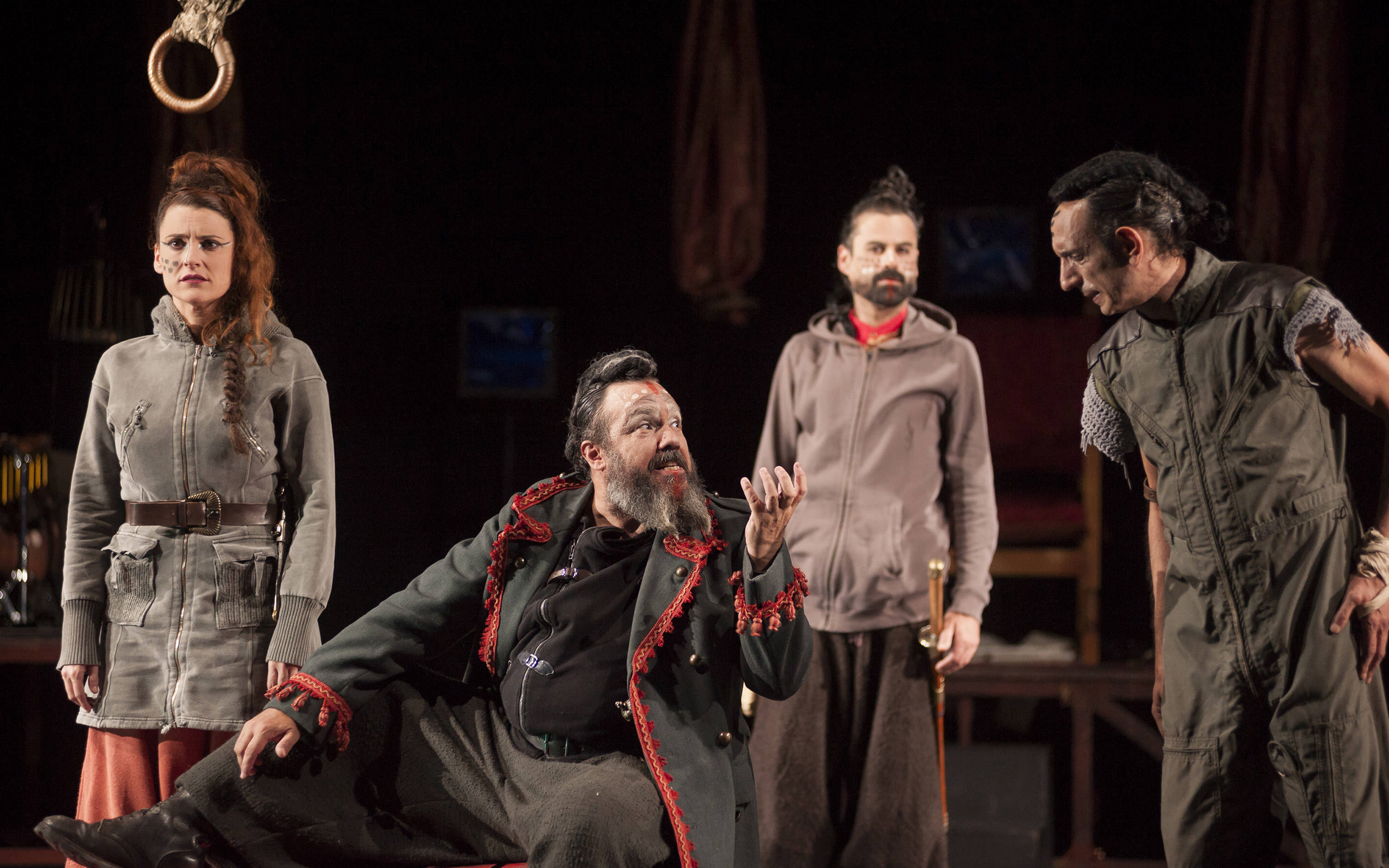 Los siete actores, que están permanentemente en escena, van a crear ese mundo casi penitenciario, donde la pertenencia o no al grupo marca la posibilidad misma de la existencia. El espectáculo cuenta con un músico en escena que crea un sugerente ambiente sonoro lleno de ritmos y sonidos evocadores y con una estética en la escenografía, el vestuario y la luz que busca los claroscuros, las capuchas que cubren o descubren, los objetos multifuncionales que junto con los actores construyen cárceles o palacios, masas en movimiento o angustiosos espacios vacíos.